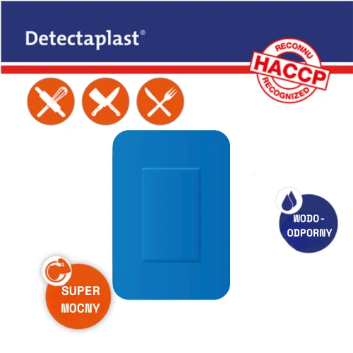 Profesjonalne plastry wykrywalne metalem wodoodporne, przeznaczone do zakładów produkcji żywności. Niezbędny element wyposażenia zgodnego z systemem HACCP, BRCGS oraz wymaganiami FDA.