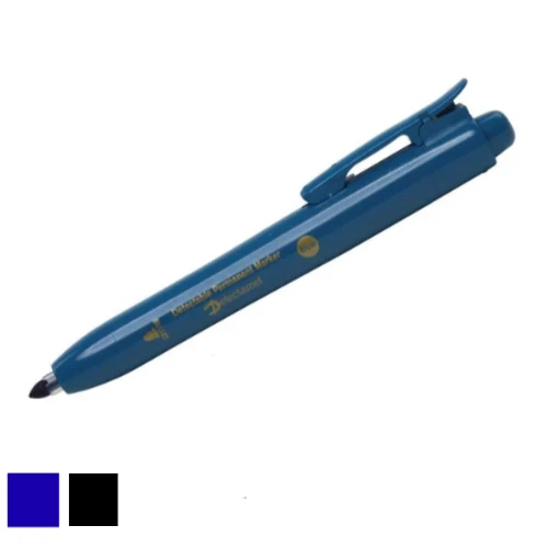 Dostępne typy końcówek: bullet tip (3–4 mm) lub chisel tip (1,5–4 mm). Atrament permanentny jest trwały i dostępny w kolorach: niebieski, czarny, czerwony i zielony.